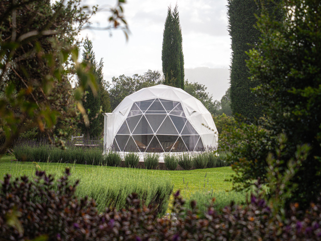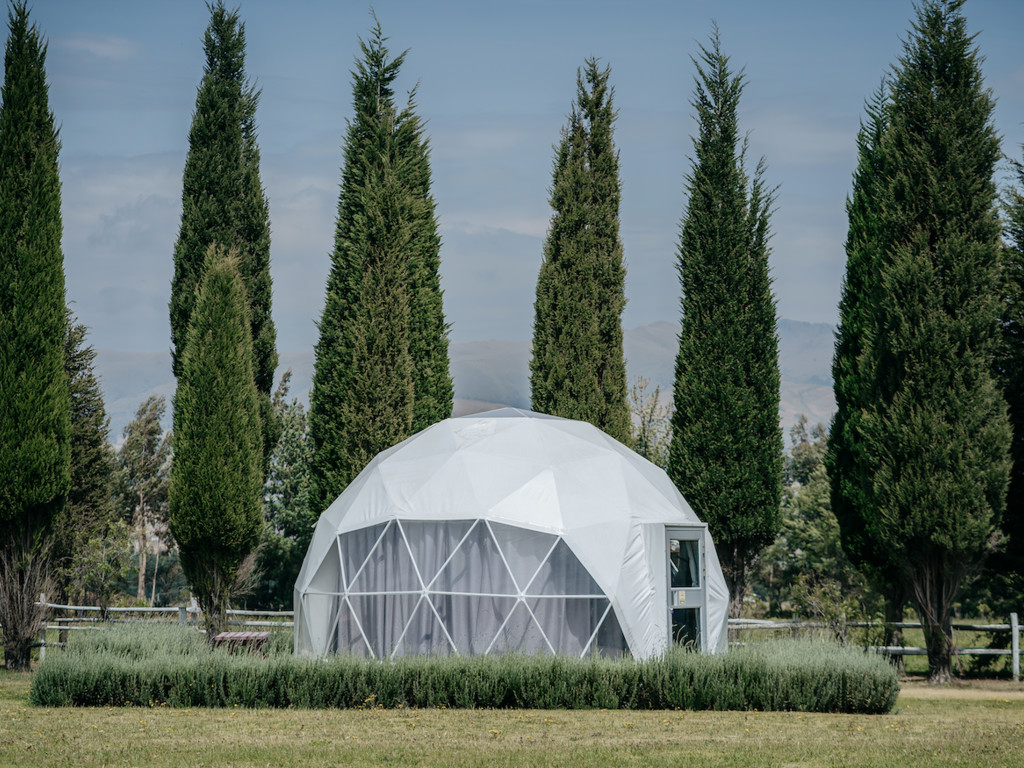 Domo de 28m2 con capacidad para 3 personas. Este domo tiene una cama queen (matrimonial) + un sofá cama de plaza y media muy confortable. Tiene un baño privado completo externo. La tarifa incluye desayuno continental.